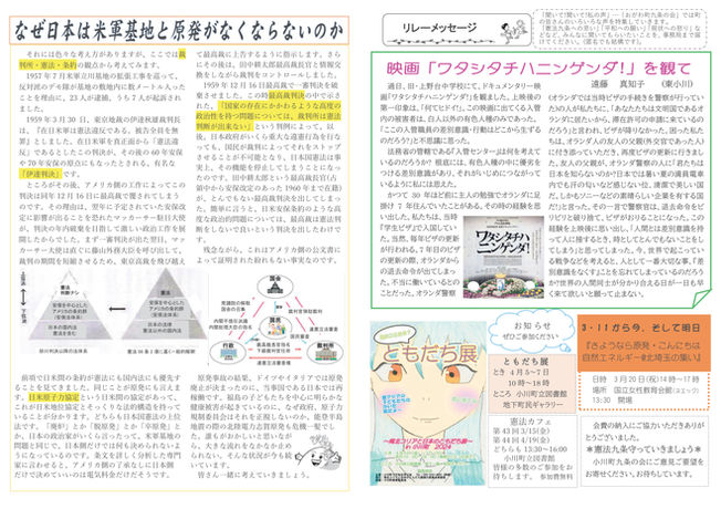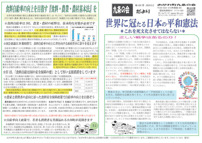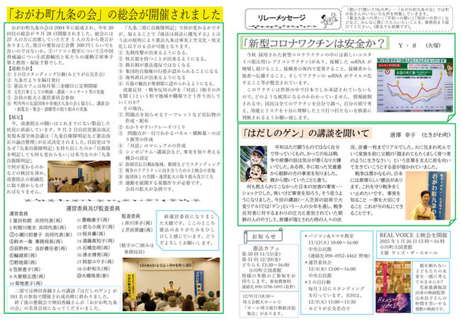 この間、ニュース(九条の会だより)は15?回発行され、手配りで小川町内に全域配布したり、一人一人の会員にお届けしてきました。どうかご一緒におがわ町九条の会に参加して下さい。
